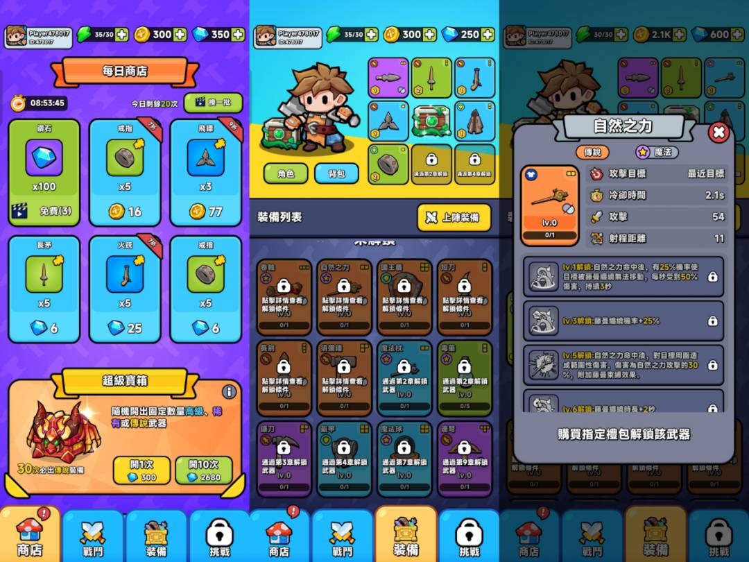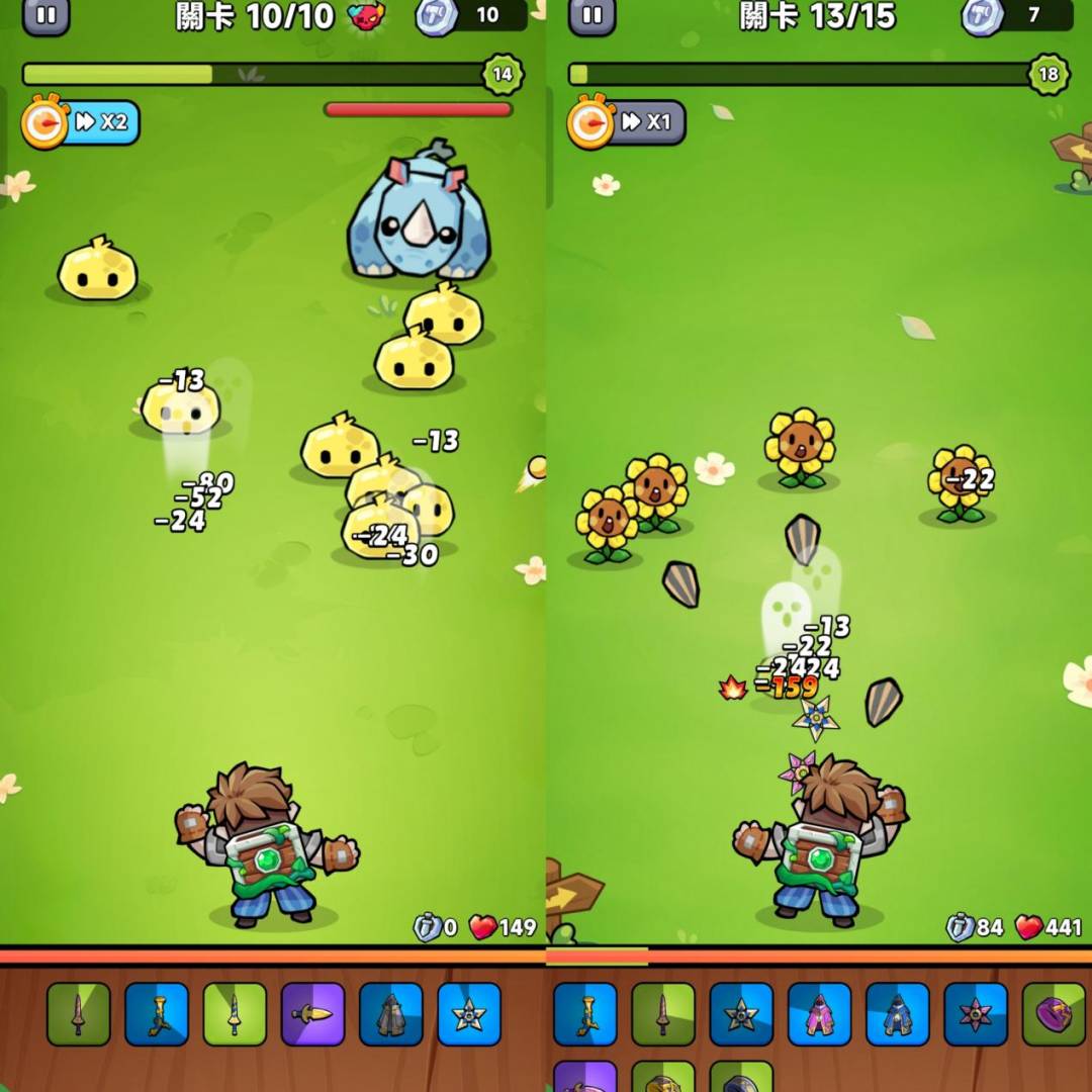 Just looking at the differences, there are three points worth noting, one is that with the version update, Weapon Master: Backpack Battle provides a gradual increase in the number of weapons, has been able to provide more than 16 different types of weapons, although the form of weapons for the more common staffs, hammers, long swords, etc., but the higher quality of the weapon has a stronger effect and output performance, and the purple and higher quality can only be purchased through the purchase of the weapon. Purple or higher quality weapons can only be obtained by purchasing packs (advertisement material also shows more powerful weapons' grass-cutting effects).